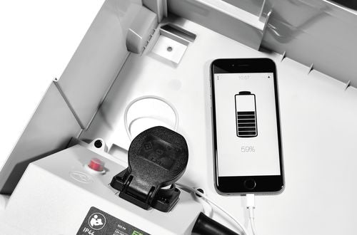 - Едновременно снабдява с ток до четири електрически машини. При нужда може безопасно да се зарежда допълнително един мобилен телефон