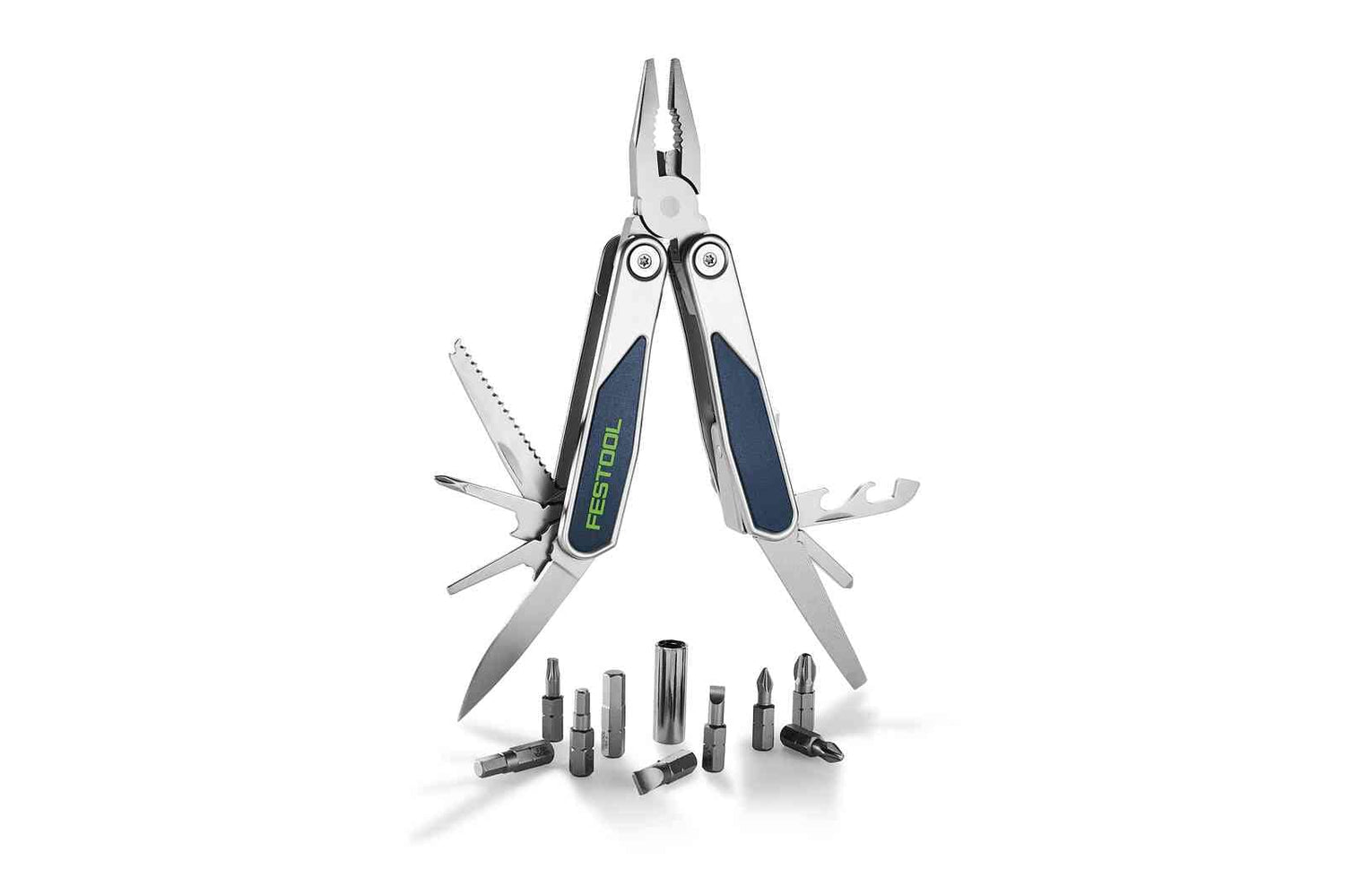 - functions: Pliers, wire cutter, file/slotted screwdriver, can opener/bottle opener, slotted screwdriver, cross-head screwdriver, saw, large blade, glass breaker, bit set with nine bits