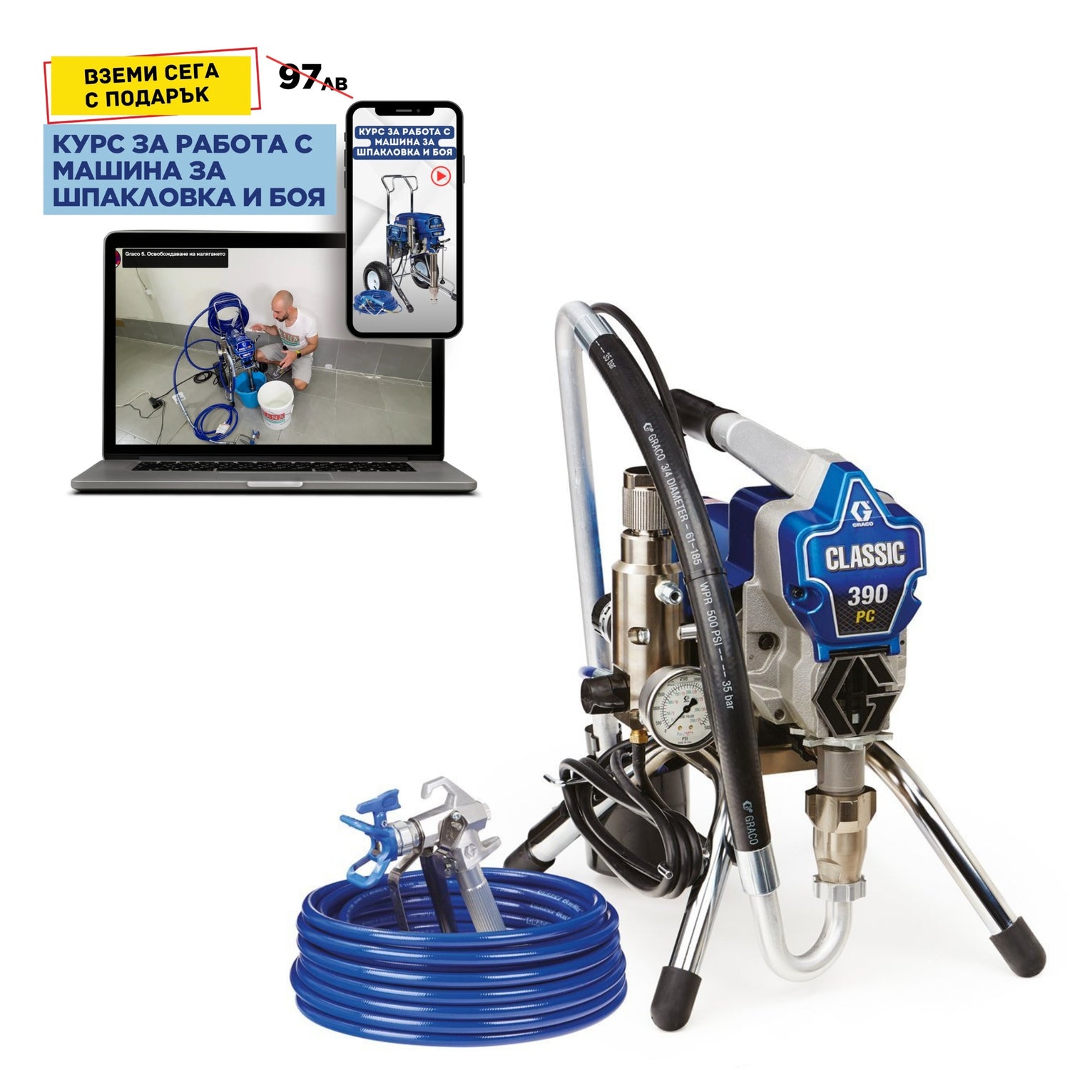 Монтираната на стойка маина Graco Classic 390 PC е лека, компактена машина за малки проекти на закрито. С тегло само 14 кг и компактни размери, тя е лесна за транспортиране с малко усилия. С дебит от 1,8 литра в минута безвъздушната машина може да се използва предимно за работа на закрито с бои, грундове или други дисперсии. Graco Classic 390 PC е особено подходяща за малки фирми или работа от един човек. Класическият модел Graco 390 може да се използва и като втора или резервна машина, което я прави полезно допълнение за средни и големи компании с големи обеми за боядисване.