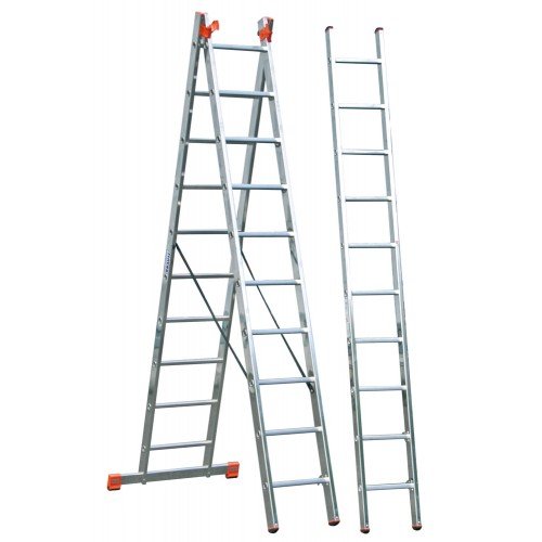 Three-section aluminium multipurpose ladder usable as a leaning, extension and freestanding ladder with an extendable ladder section.