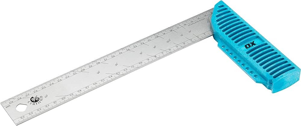 The OX Pro Carpenter's Square and Angle Indicator allows accurate, certified 90' measurement. Its stainless steel rule is permanently etched with 22.5', 45' , 67.5' and 90' and the high-impact polymer handle features a unique support ledge which balances the square for one handed marking.