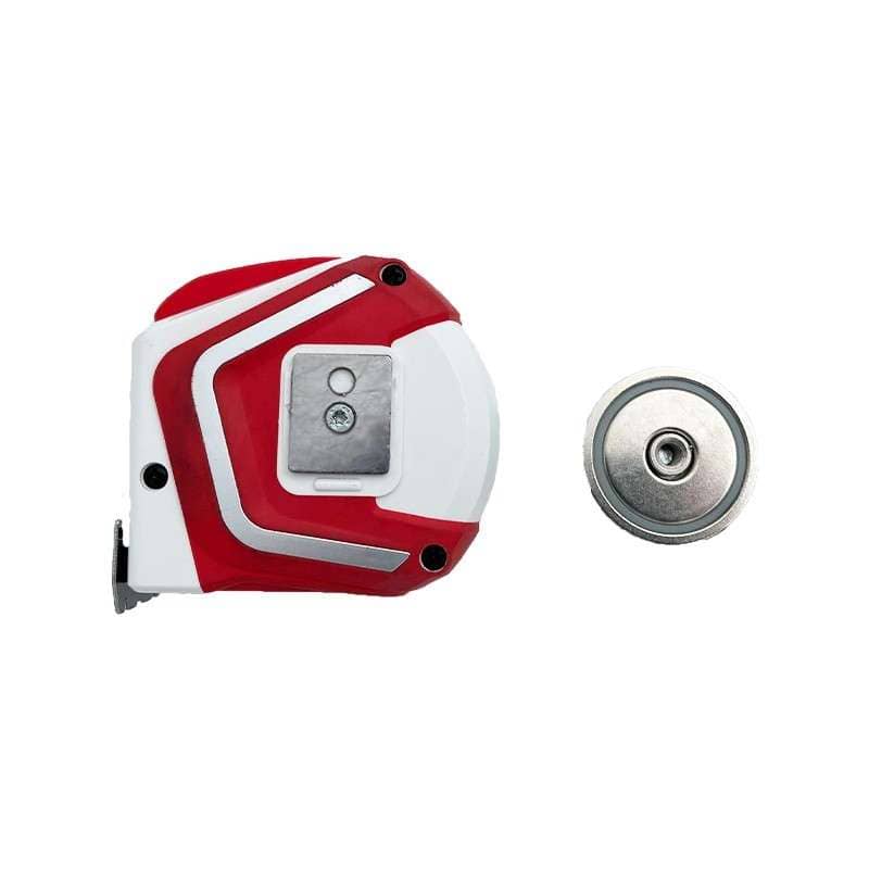 - The set includes all the parts necessary for attaching the magnet to the belt: a 6 mm diameter screw, a stainless steel plate and a lock for the tape measure.