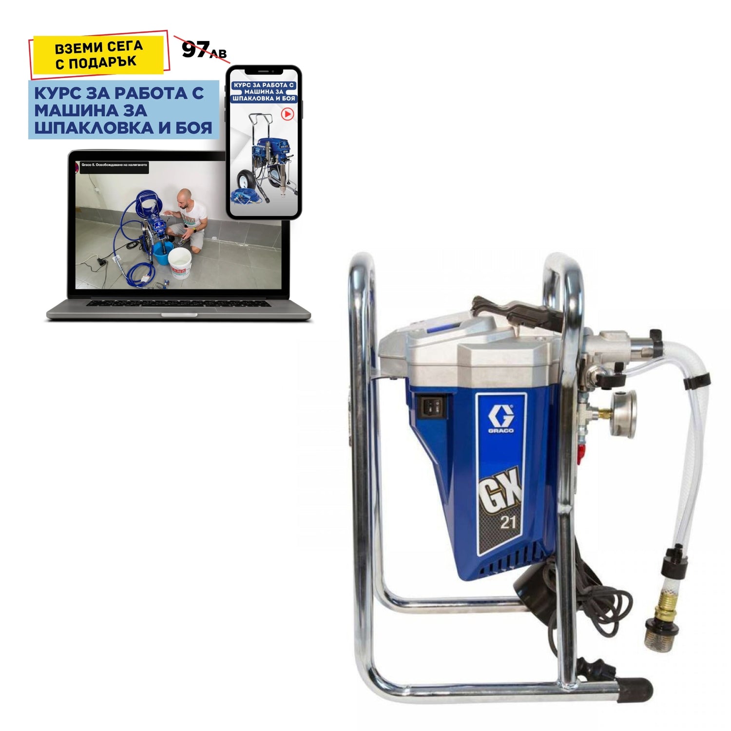 Безвъздушна бояджийска система Graco GX21 е с максимално работно налягане 207 бара и максимален дебит 1.4 л/мин. Помпата може да работи с повече стандартни алкидни грундове за метал, както и с най-често използваните алкидни грундове и лакове за антикорозионна защита, а също с водоразтворими бои. Капакът предотвратява пръски и разливи по време на носене. Малкото налягане в мъртва зона осигурява възможно най-финото покритие.