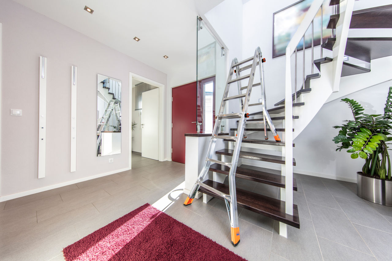 - Чрез телескопичното плъзгане на рамената на стълбата от стъпало до стъпало, стълбата се приспособява към най-разнообразни терени.